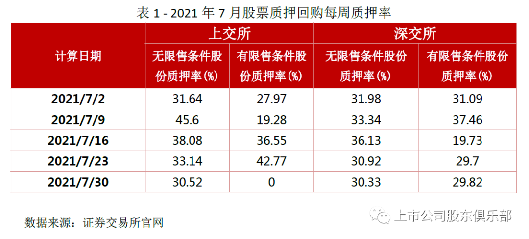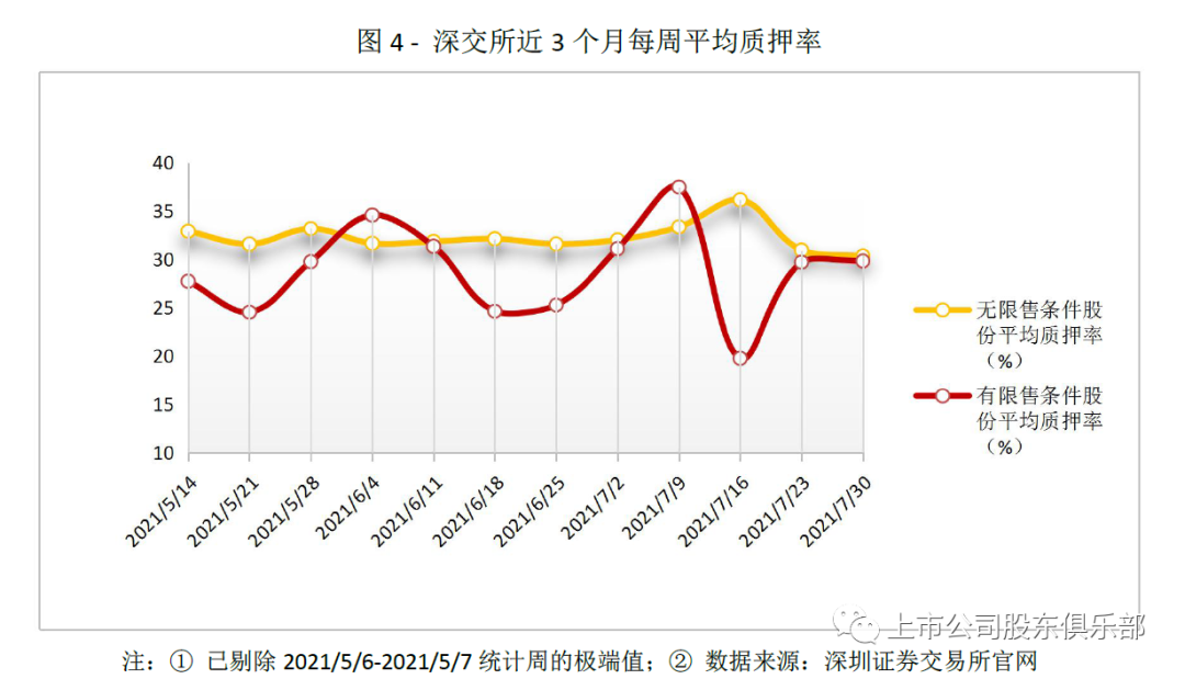 2021年7月最后一个交易周数据显示,上交所无限售股平均质押率为30.52%,限售股无数据,深交所无限售股平均质押率为30.33%,限售股平均质押率为29.82%。去除交易周的零质押率极端值,将7月份各交易周的质押率进行简单平均,可以发现上交所的无限售股质押率月平均为35.80%,限售股为31.64%;深交所的无限售股质押率月平均为32.54%,限售股为29.56%。除上交所限售股质押率相比6月有所下降,其他均有上升。