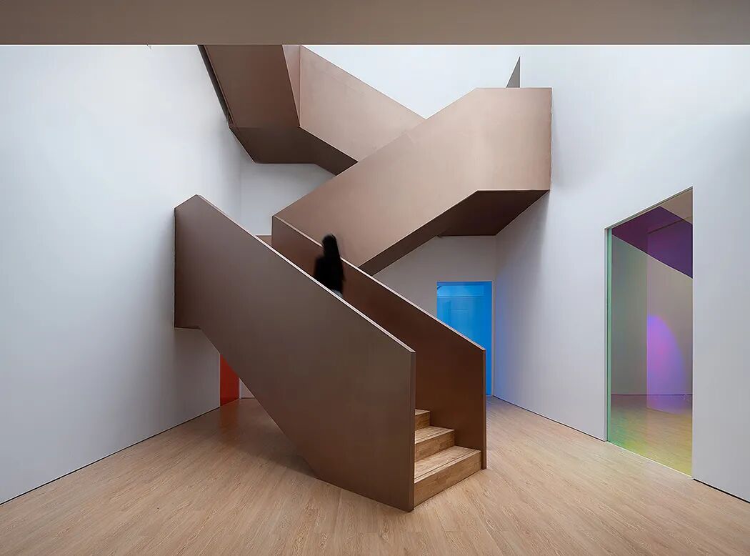 Corridors as the secondary space of the gallery, the designers do not do too much concealment, but make it a continuation of the exhibition hall. Walkways are arranged around the atrium. The brilliant light and shadow of the projection lamp on the white walls make people interact with it inadvertently. The corridors connect each exhibition space, which ensures people's continuous experience during the viewing process.