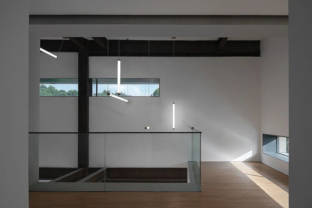 The glass on top of the atrium is arranged in an orderly manner. The sunlight falls gently through the skylight, forming mottled light and shadow on the white walls. The window frame uses the minimalist design language. The stable light filtered by the U-glass skylight is introduced into each interior space, therefore, the atmosphere of tranquility is created, bring people the guidance of unrestrained thinking and triggers infinite reverie.