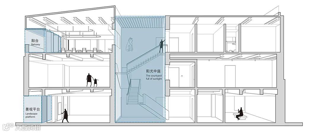 路易斯·康说「自然光给予了空间特性,也给予了建筑生命。建筑的生命由光的照射而产生。基于此,除非给予建筑生命,否则没有一个空间是真实存在的。」设计师的思考由此展开。在项目的整个设计中,可以说“光”参与了空间的创造与再组织。面对现状建筑,设计师决定保证原有建筑结构的完整性,同时适当地减去不同尺度的矩形体量以形成丰富的空间形式和层次,给光创造多尺度和多维度的引入空间,使光影与空间产生无限的可能性。