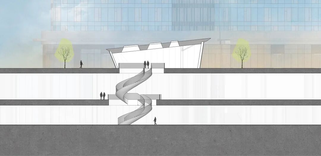 当走进广场时,可见动态的曲线的建筑全貌。设计过程中将最初的多曲面优化成效率更高的单曲面,金属墙体从地面边界生长,滑行路径延伸至屋面,屋面向外延展再向内汇聚,端部指向周边塔楼,加强动态感和整体感。