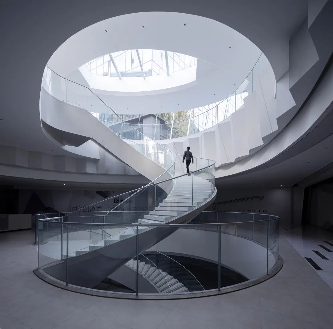 540度大型螺旋楼梯与超薄扶手,将动态感表达的“淋漓尽致”,减小了“地上—过渡—地下”这一空间序列中设计概念的磨损。顺着螺旋楼梯向下,参观者的视觉体验感逐渐转变为漫步路径的身体体验感,将注意力更加集中,走向艺术展览区域。