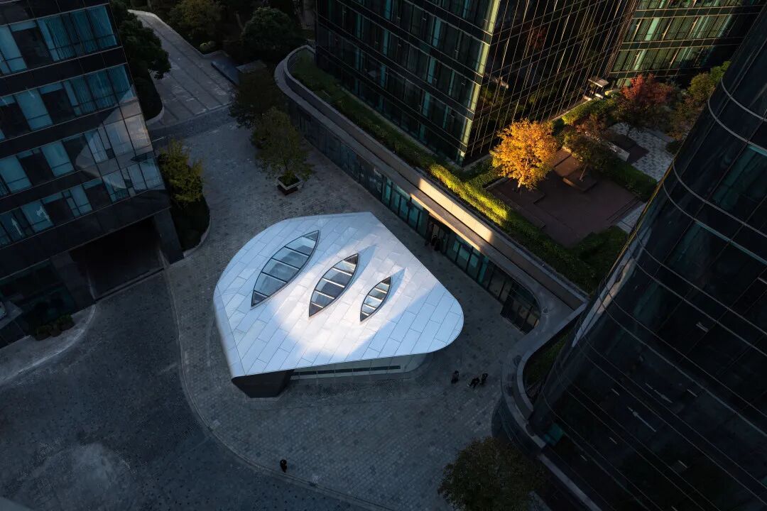金臣汇商业综合体宽阔的中心广场,和临近航空场地的背景,为上海金臣·亦飞鸣美术馆提供了形体的灵感。
