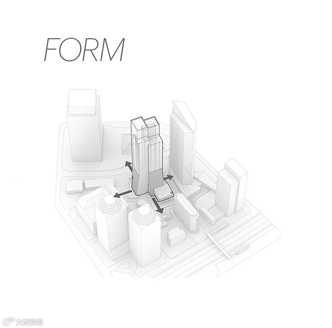 "在地面上,该项目将目前分离的相邻街区重新整合成一条蜿蜒的行人连接带。在其体量上,四个捆绑的管子的变形不仅产生了结构意义,而且增加了整个塔楼的编程机会,允许大的楼板与公共设施在底部和天空花园向顶部。