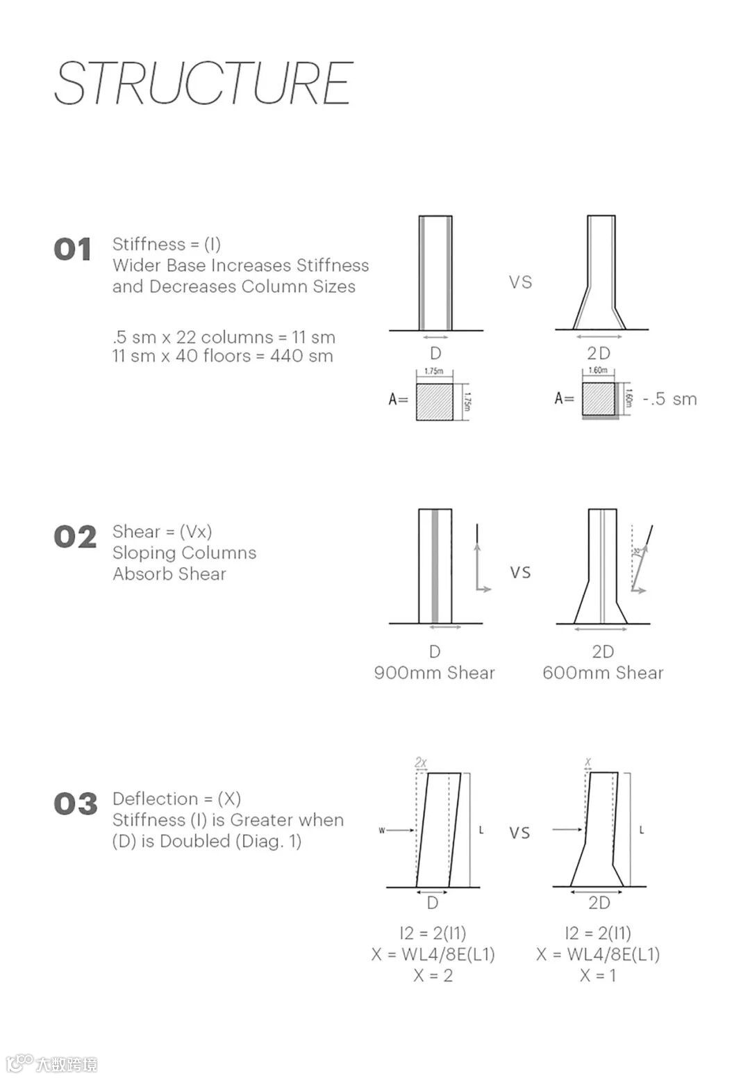 该塔楼由四根捆绑和偏转的 "超级管 "组成,相互嵌套和偏移。这种形式不仅创造了视觉上的趣味性,还产生了一系列的楼板,从而形成了独特的办公类型,并在活跃的地震区提供了更大的结构稳定性。
