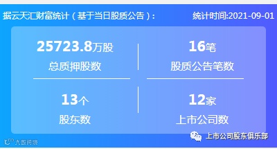 2021年9月1日,股票质押总质押股数25723.8万股,上市公司数12家,股质公告笔数16笔,股东数13个。