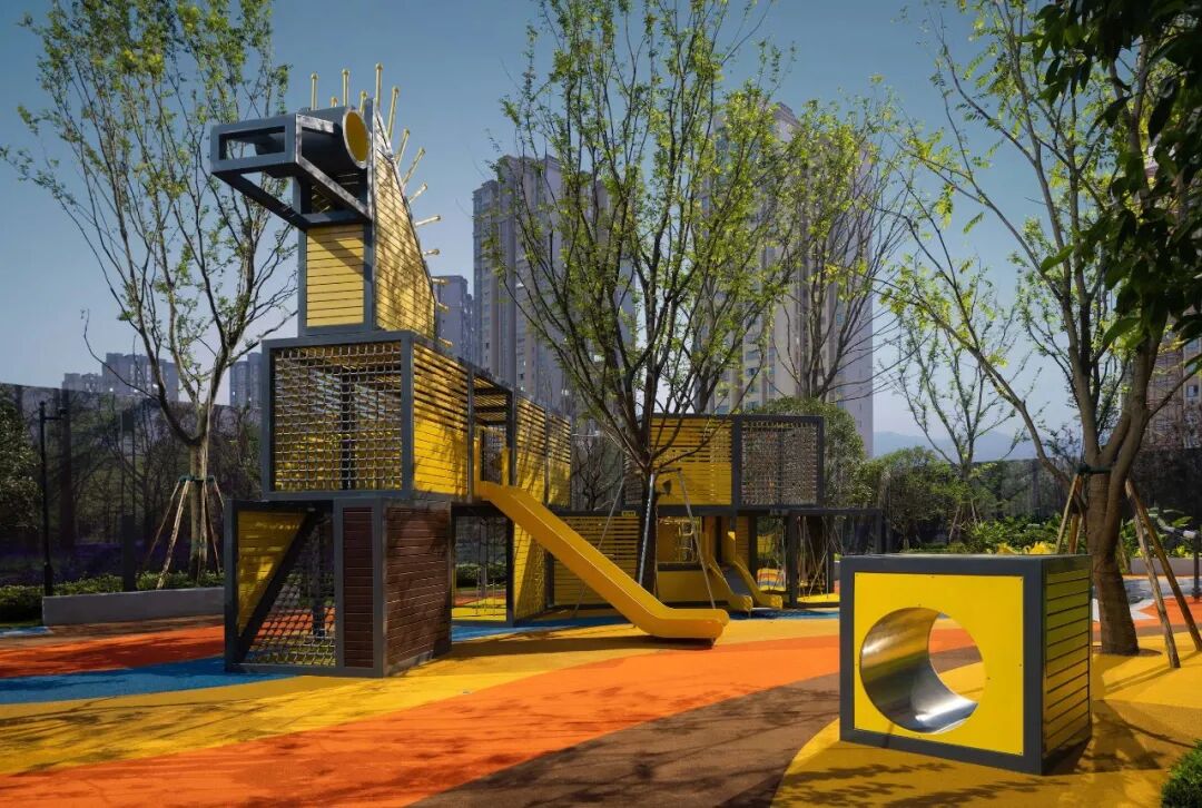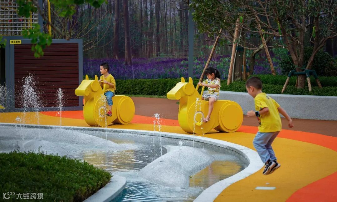 童梦空间的设计,延续了东原集团的“东东马”IP,在空间处理上,打破以往的边界感,把水系延伸、绿岛渗透、片林穿插,形成既独立又相互参透的有机空间。“鱼背岛”、小桥、感应水景等细节的加入,让童梦空间增添了更多的参与性与趣味性。