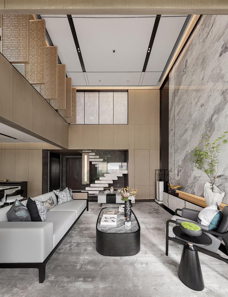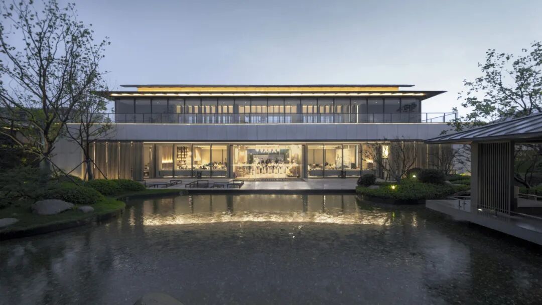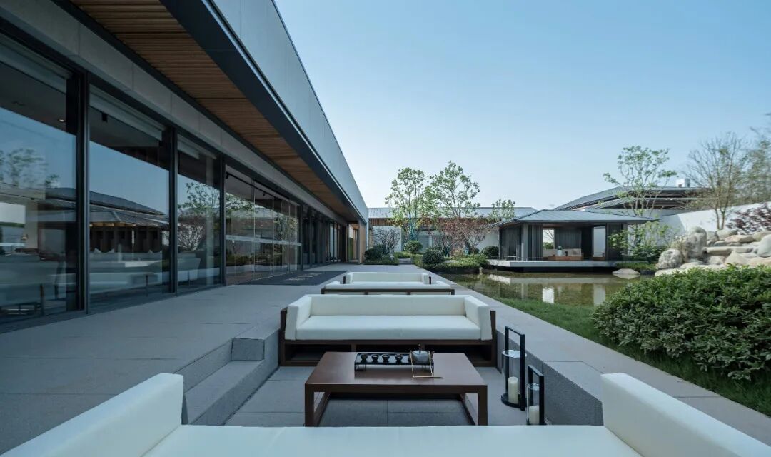 如山水拾间采用国际中式的设计手法,从传统中式建筑的檐、院、 墙、窗、门等元素汲取灵感,提炼、整合、再设计,通过全新的建筑语言结合江南水乡的诗意,对中式风格重新诠释,将传统与现代有机统一,回归本真。