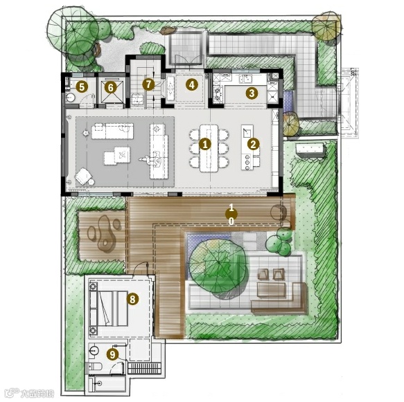 合院是别墅类产品的2.0版本,是以围合的内庭院为核心,具有私密性的由内向外延展的生活方式,各功能区有序排布,更具有东方空间层次。