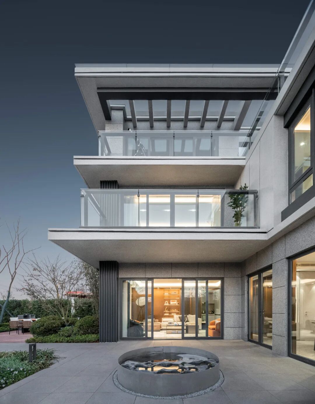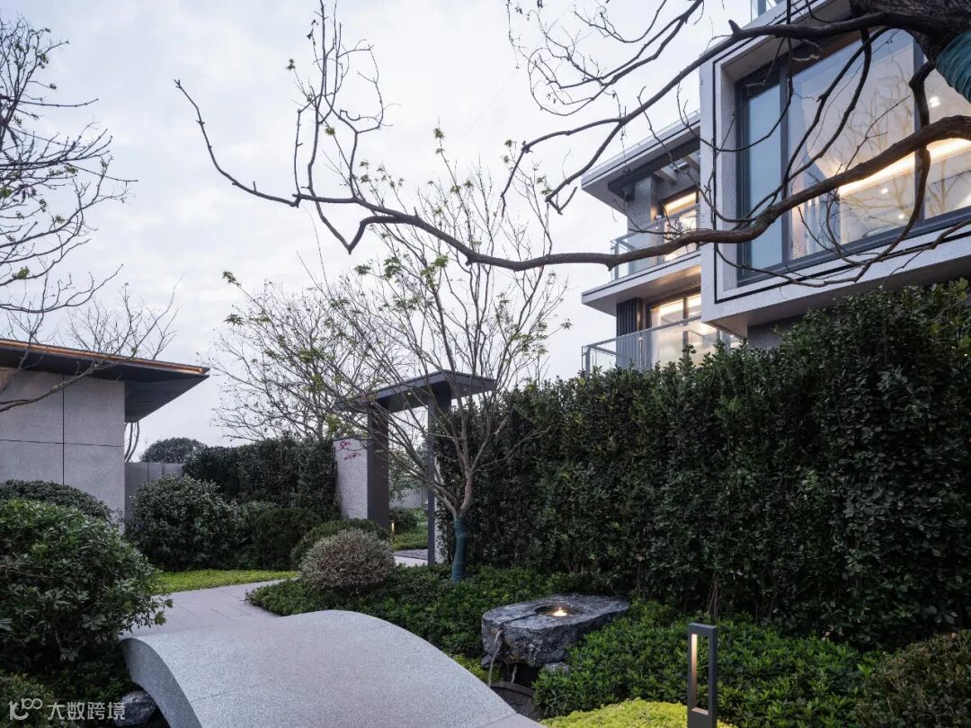 江晚庭合院,几个叠级的景观空间,错落有致,让整个空间更加立体而丰富,也使得整栋建筑和景观之间形成极好的互动关系,空间形态交融而灵动。