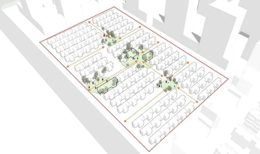 此外,街巷之间的交点很多,零星分布,并设置了各种景观小品,于此或是停留,或是交谈,拉近了邻里间的互动,满足了现代人对空间体验的品质要求。