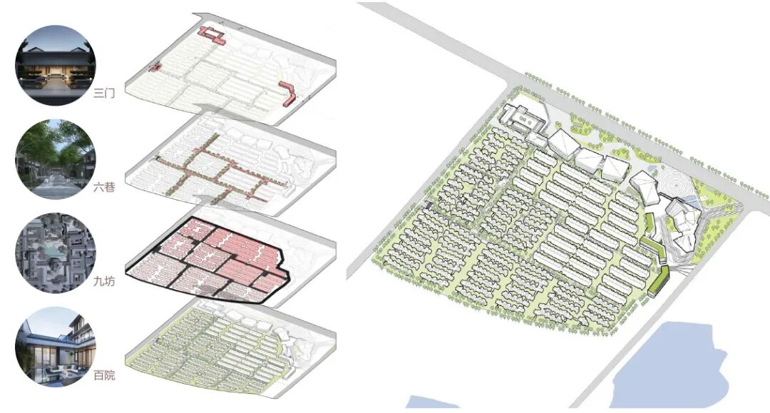山水拾间,仿照古代名门的“归家礼序”,布局为“三门、六巷、九坊、百院”,建筑布局继承了传统空间中化整为零的思想,形散而神不散,多重功能建筑被打散成各个体量轻巧的建筑体,成为建筑群。