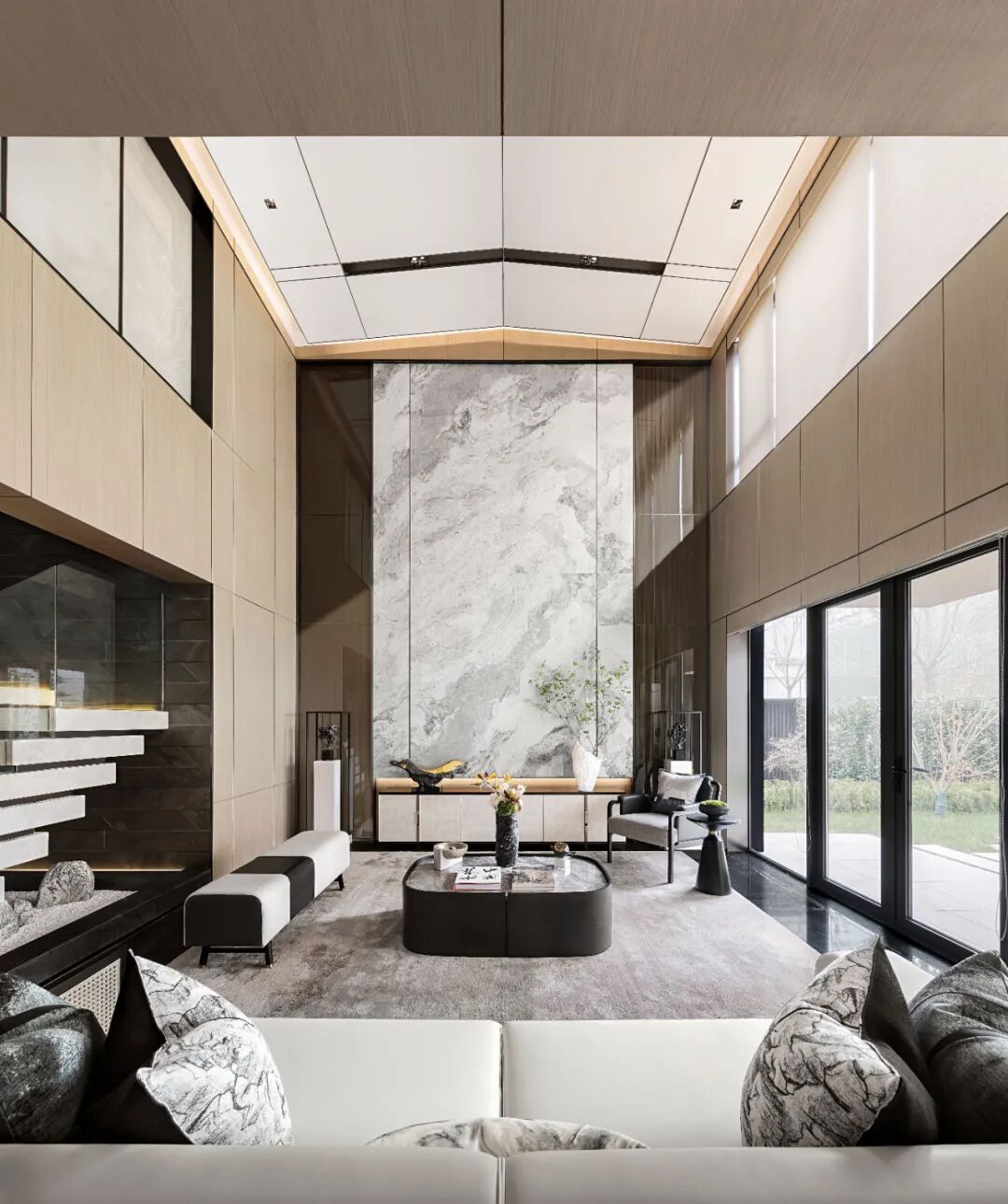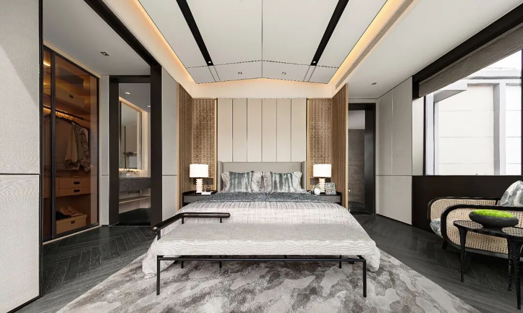 将传统中式厚重的“外衣”巧妙剥离,以大面积玻璃布局,在山水拾间项目中,玻璃最大尺寸达到约6.2米,塑造轻盈灵动的建筑姿态,呈现出一派大道至简的生活意境和高级的艺术美感,拉近了居者与景观的交流互动,打造出一个真正让城市高净值人群为之动容的合院。