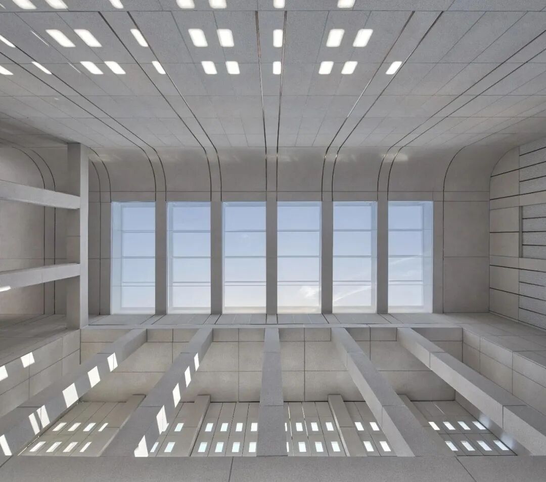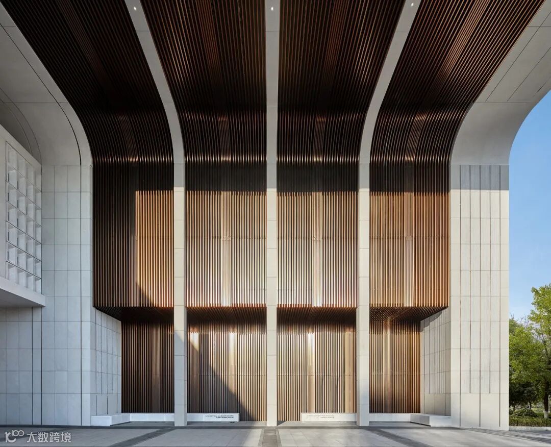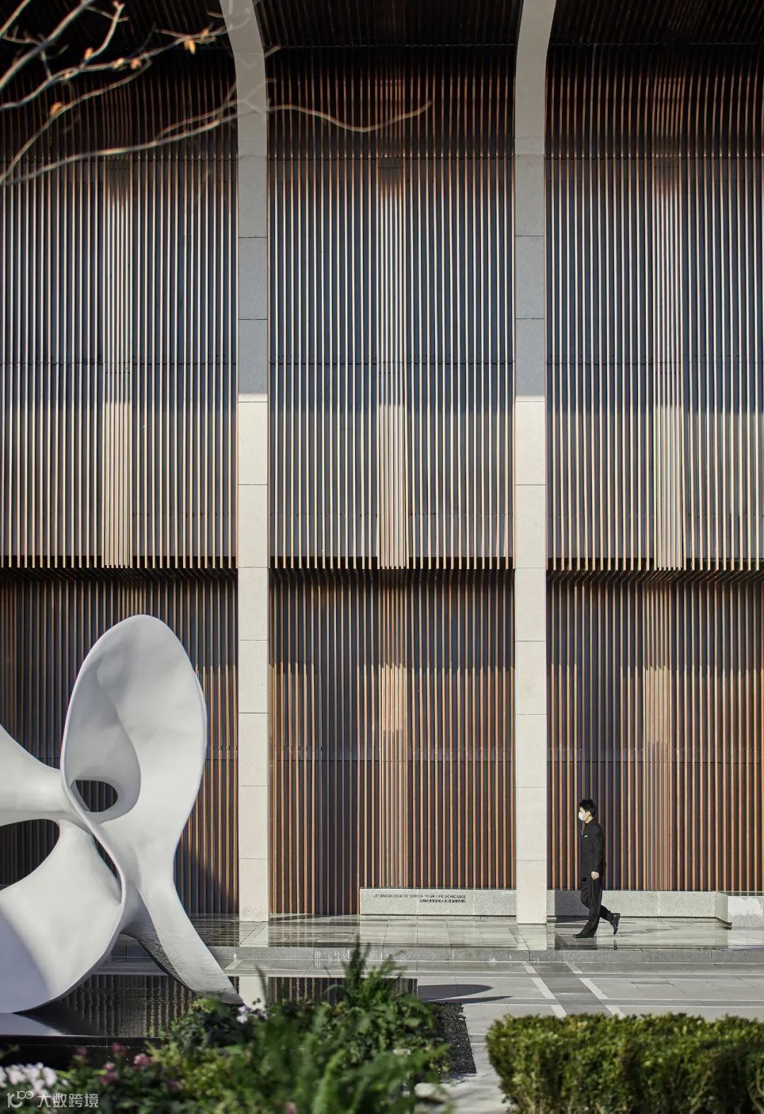 作为进入整座建筑的门户形象与落客大堂,入口设计一反常规,以超尺度的12米挑高、40米进深空间呈现出稳重大气的氛围。同时与前广场的景观设计联动,以“学海潮起”的意向延续建筑的造型,线性韵律贯穿于立体空间的始末,其内在深意通过张弛有力的形式表达,让人彷佛“东临碣石”、体悟“以观沧海”的意境。