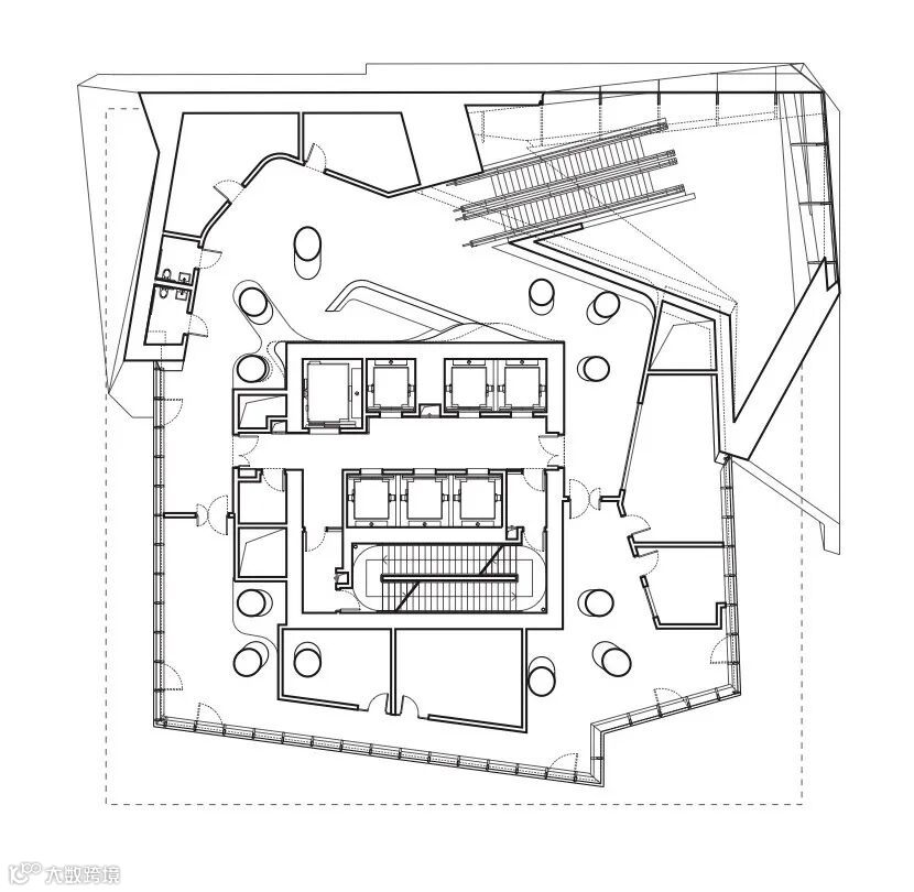 与街道层面相映成趣的是,该建筑与低层城市景观相融合,外部的公共规划邀请社区进入邻近的公共空间。这种双重冠冕使建筑同时成为城市发展的象征,也成为培养该区活跃的街道生活的社会中心。
