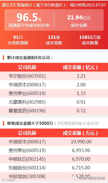 2021年7月7日,大宗交易成交金额21.94亿元,交易股票数91只,成交笔数131笔,流通股平均成交折价率96.5%,成交数量15852万股。
