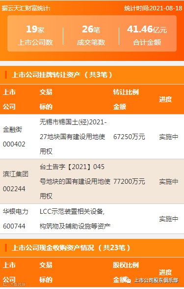 2021年8月18日,资产交易合计金额41.46亿元,上市公司数19家,成交笔数26笔,上市公司挂牌转让资产3笔,上市公司现金收购资产23笔。