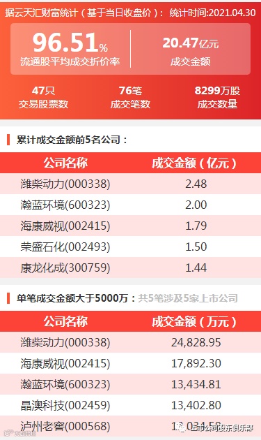 2021年4月30日,大宗交易成交金额20.47亿元,交易股票数47只,成交笔数76笔,流通股平均成交折价率96.51%,成交数量8299万股。