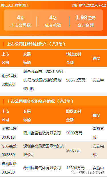2021年7月12日,资产交易合计金额1.98亿元,上市公司数4家,成交笔数4笔,上市公司挂牌转让资产1笔,上市公司现金收购资产3笔。