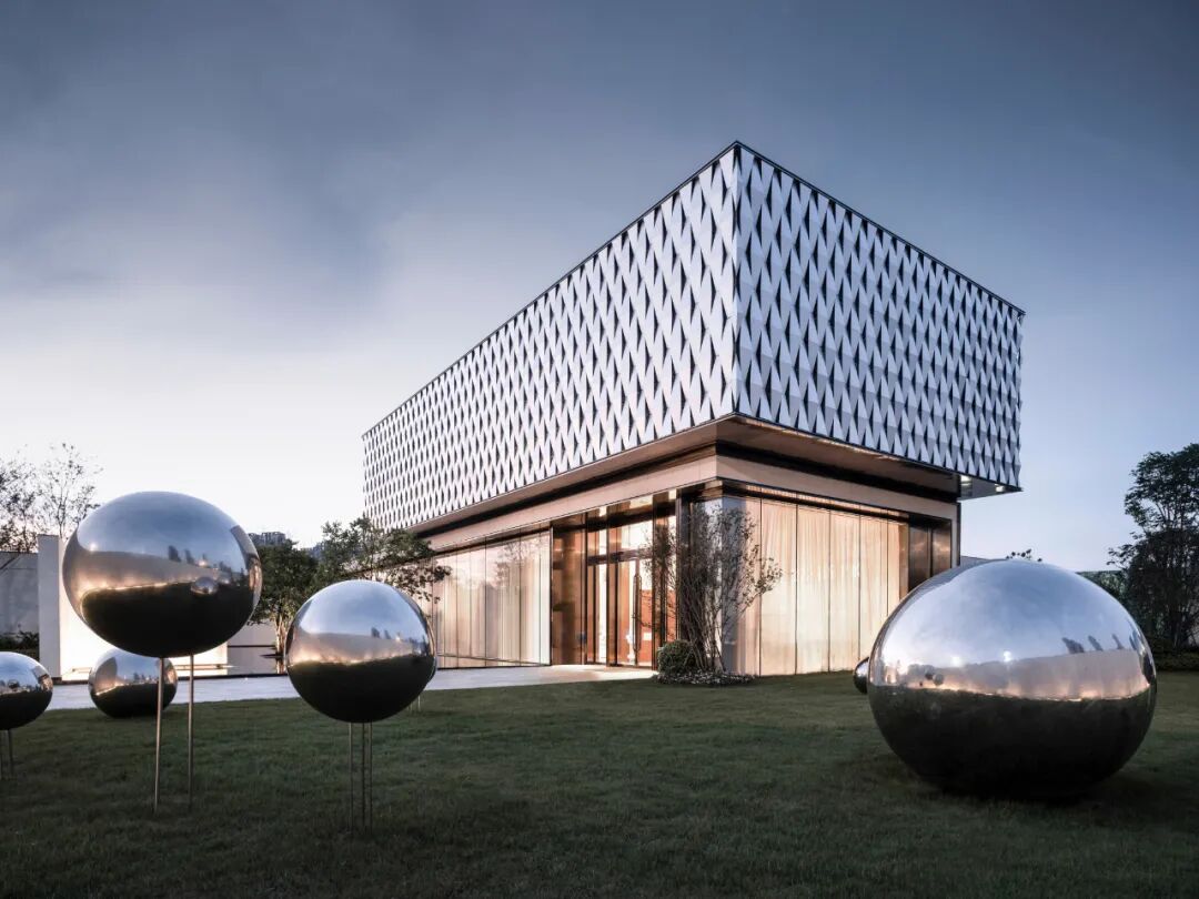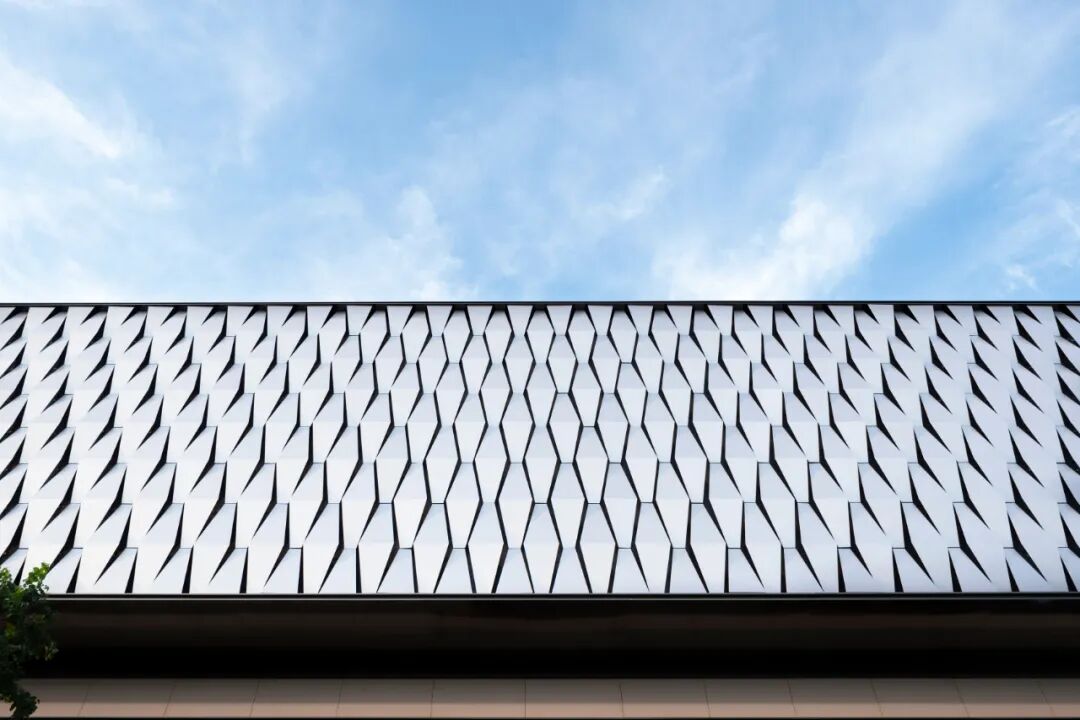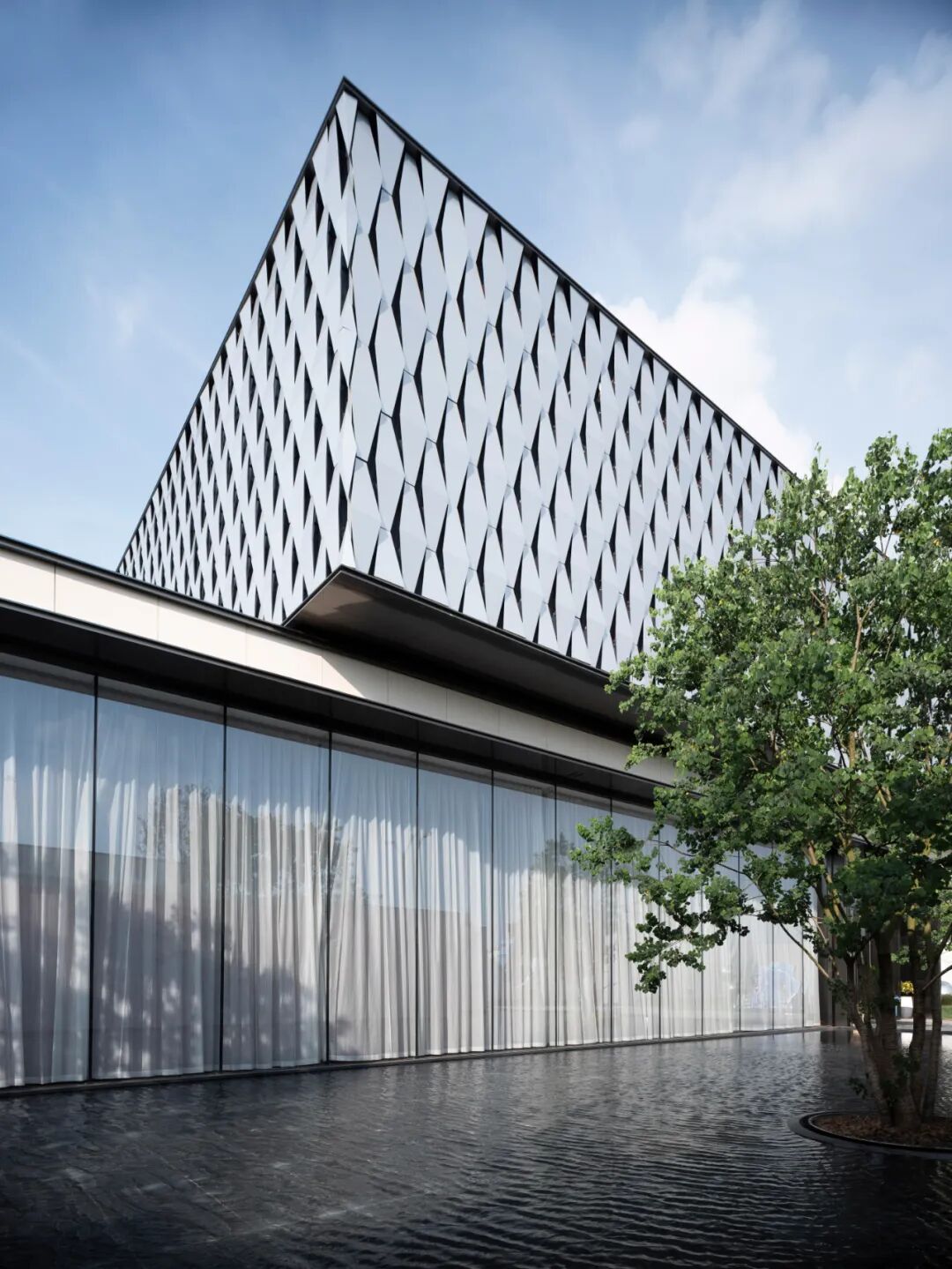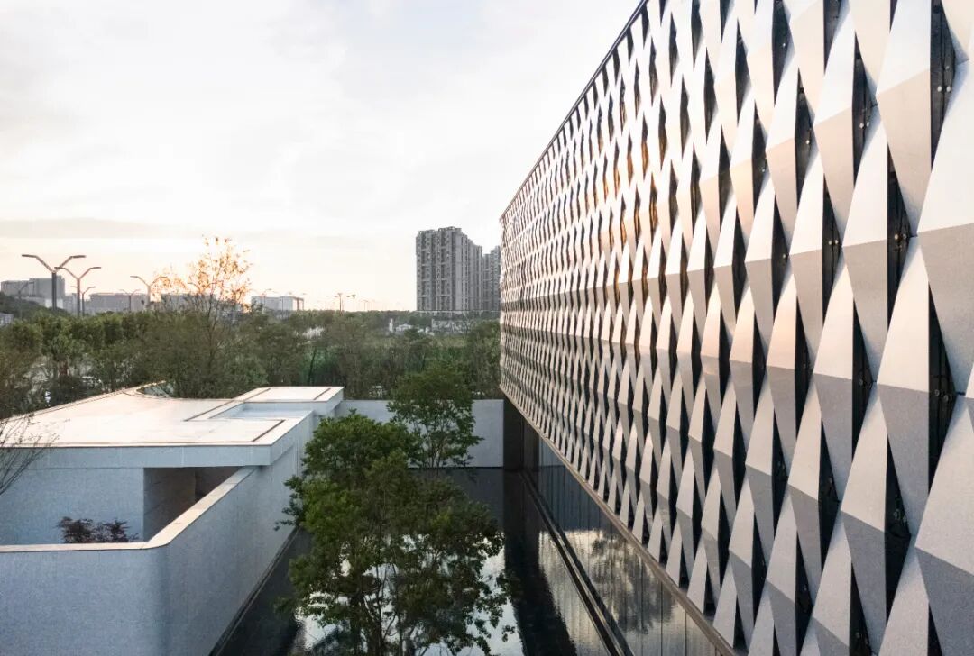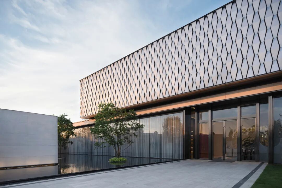 整体选用浅色金属铝板、简洁的单元等具有识别性材料,利用编织的手法强调现代感的精致。