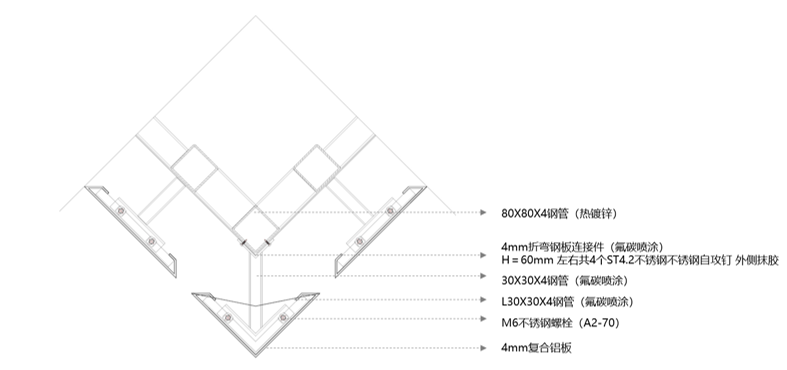 编织幕墙就是用最简单的基本元素拼接而成,为了让幕墙有律动和变化,我们设计了菱形的有凹凸变化的折型铝板,并且在拼接的时候预留一定的间隙让铝板之间形成空间的视线变化,在不同的视角下,形成不同的建筑立面效果。