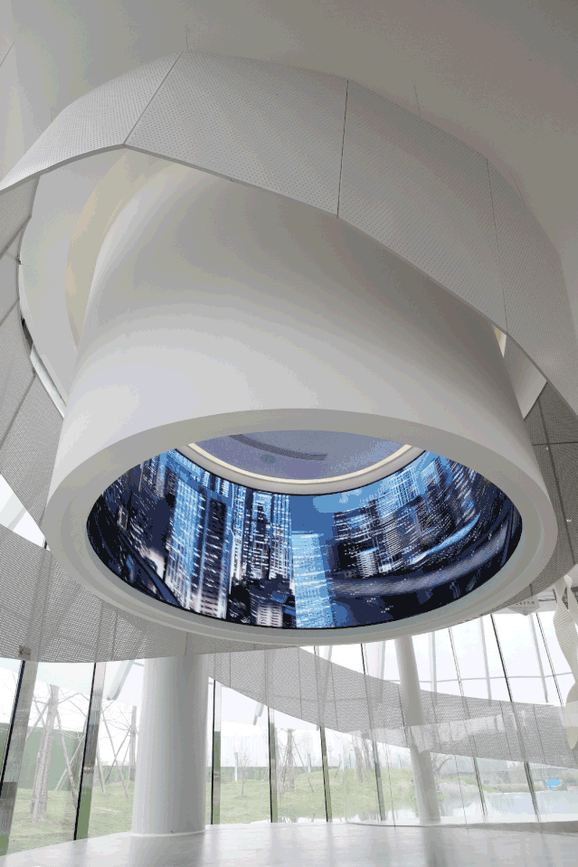 在医疗体验馆里,中央的雕塑装置与外部环形曲线调性统一,隐喻着生命的生生不息。