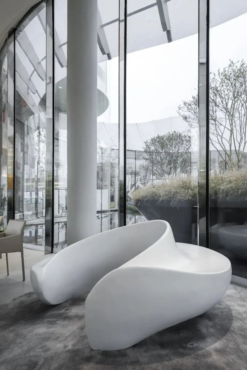 作为展示区,室内场景同样重要。售楼处整个空间采用了流动的曲线形式,与外立面线条契合。空间里的每处艺术装置都充满巧思,都是对生命奥秘的一次探索。
