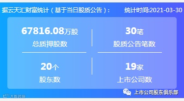 2021年3月30日,股票质押总质押股数67816.08万股,上市公司数19家,股质公告笔数30笔,股东数20个。