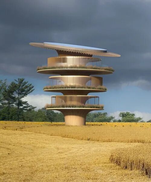 sunflower house is designed for the italian region of umbria, renowned for its rolling farmland and yellow fields of sunflowers, where heatwaves are becoming more frequent and extreme. elevated from the ground to minimize interference with the biodiversity of its surroundings, the solar panels on its petaled roof rotate on sensors for maximum sun exposure. ‘artificial structures require large foundations, but with sunflowers nature achieves a beautiful balancing act,’ says koichi takada. ‘there is minimum intervention on the ground so the earth has room for other activities, yet the sunflower magically nods its head to bathe in the light. the italian word girasole literally means ‘turn to the sun’
