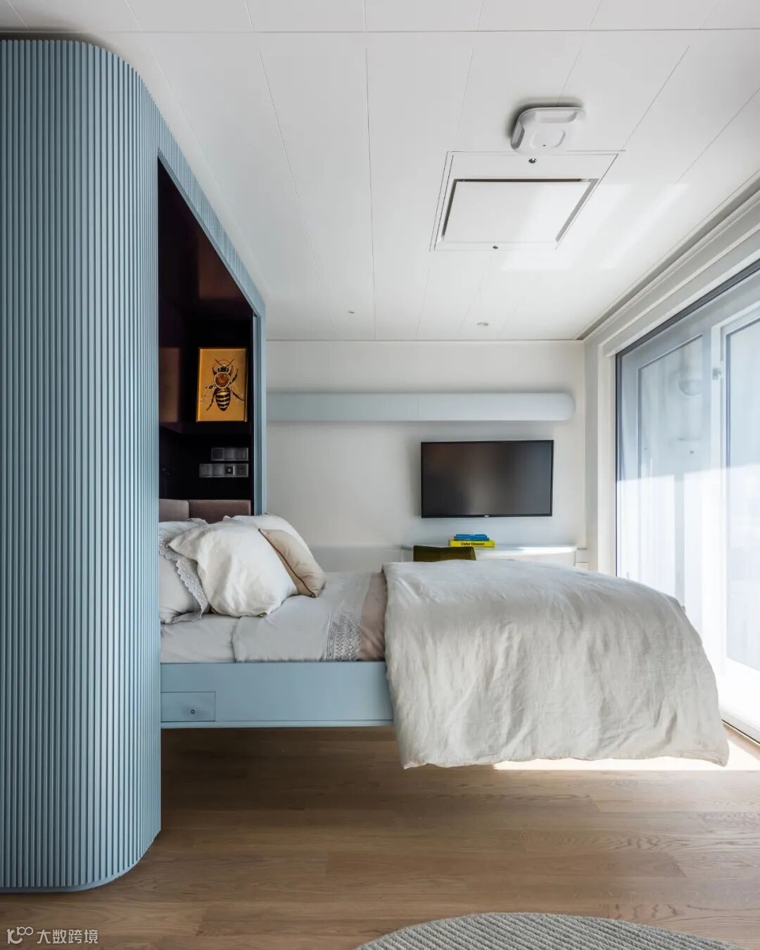 公寓的连续玻璃墙通向私人阳台,可以看到外面的景色,可以看到从海到陆、从白天到夜晚的广阔视野。