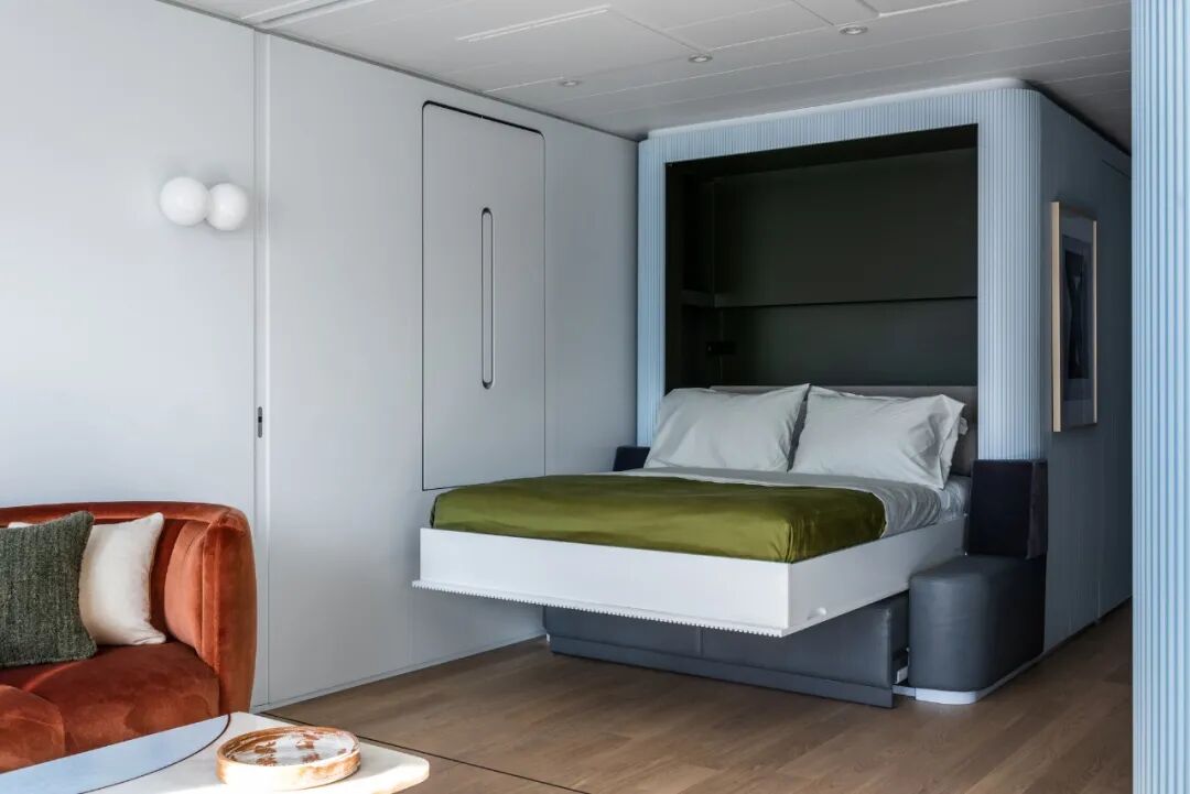 Within the 600-square-foot space, MKCA has included two bedrooms, two baths, a kitchen, a dressing room, a sitting area, a trunk room, and a landing zone. When needed, the dining area converts easily into the second bedroom, with the dining table collapsing into the wall to make way for a sleek cantilevered fold-up bed. When converted into a two-bedroom space, a sliding screen divides the apartment, allowing privacy for guests. All custom architectural elements were largely prefabricated in the shop of yacht builders outside of Vienna and installed during a five-week dry-dock period in Spain.