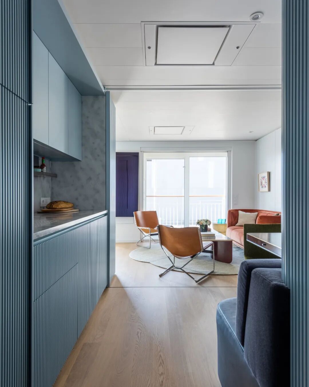 在改造成两间卧室的空间后,一个滑动屏幕将公寓分隔开来,为客人提供隐私保护。所有定制的建筑元素大部分都是在维也纳以外的游艇建造商的商店预制的,并在西班牙为期五周的干船坞期间安装。