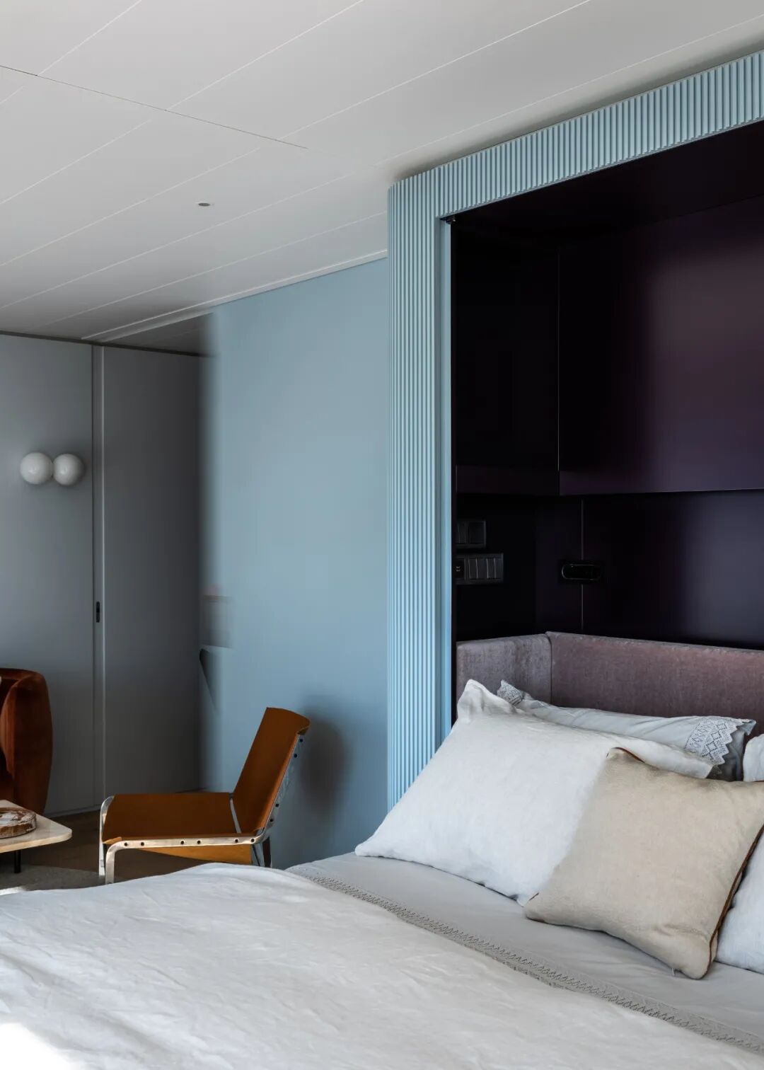 Playfully dubbed by MKCA as a pied-à-mer, the residence serves as a holiday home for a couple and their grown children, transforming seamlessly from a spacious one-bedroom to a two-bedroom apartment through tables and beds that fold away and unfurl as necessary. As a jumping-off point for the project, MKCA looked to modernist architecture’s fascination with nautical design, which optimized for small-scale living, modular organization, and efficiency.