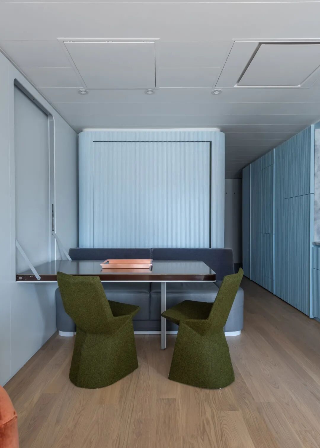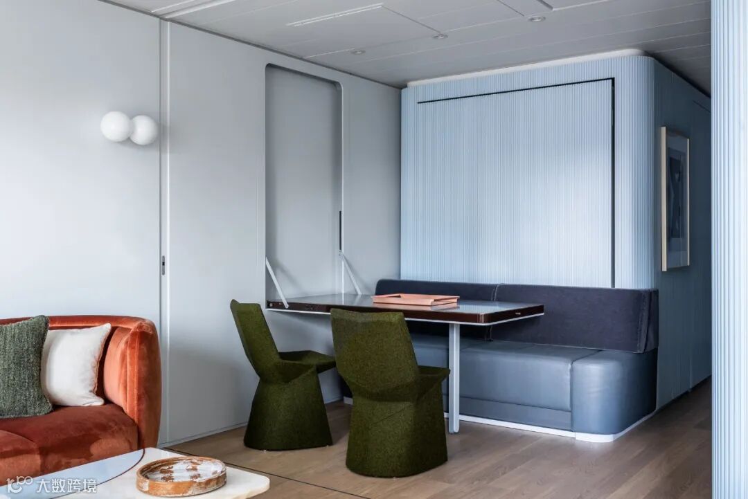 在需要的时候,用餐区可以很容易地转换成第二间卧室,餐桌塌陷到墙上,为一张圆滑的悬臂折叠床腾出空间。