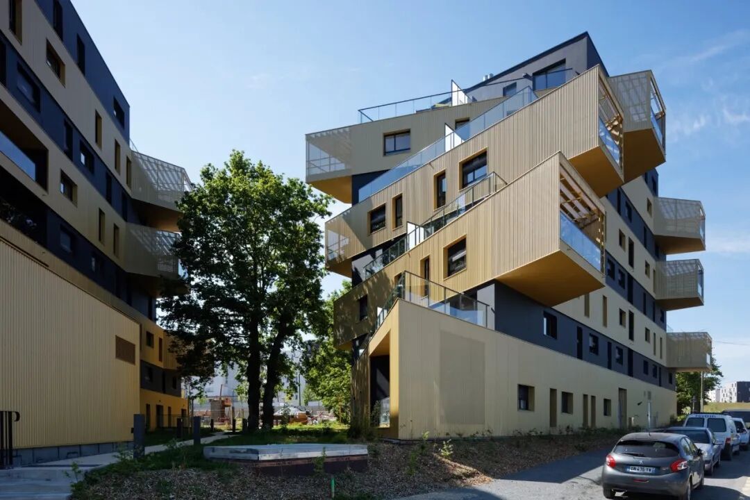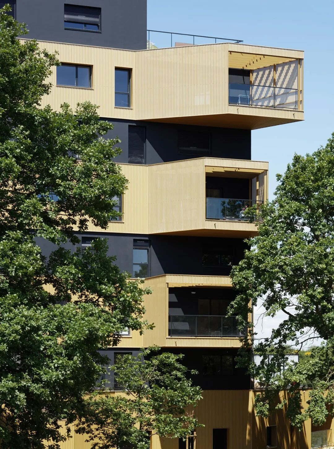 On the ground floor, the project builds a continued facade to the street, while higher up the floors some setbacks allow offering the apartments open terraces while strengthening the lightness of the structure with random openings. The rationality of floorplans, which offer a large majority of multi-orientation housing while limiting the number of elevator shafts, really helps saving construction costs and maintenance. The project, very vertical in its design, seems visually horizontal thanks to the work done every two floors including the golden metal cladding, adding the presence of exterior continuity for volumes.