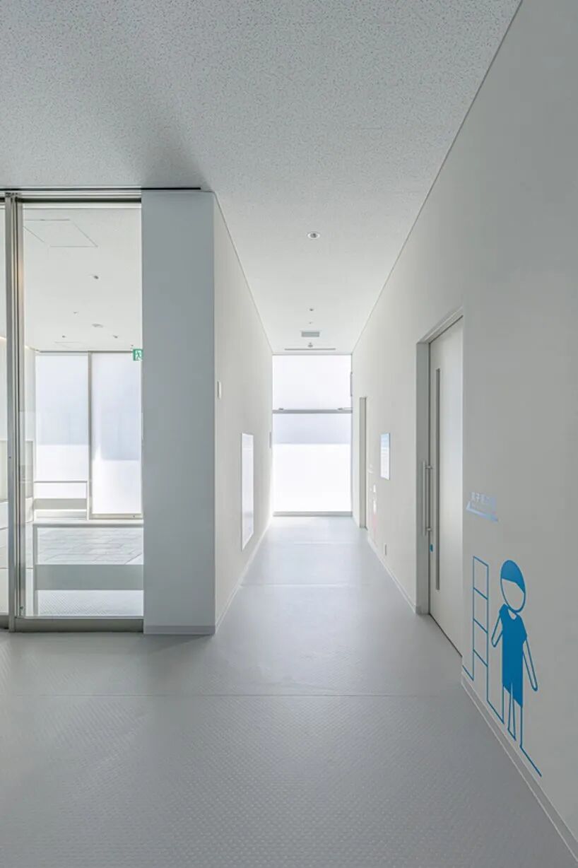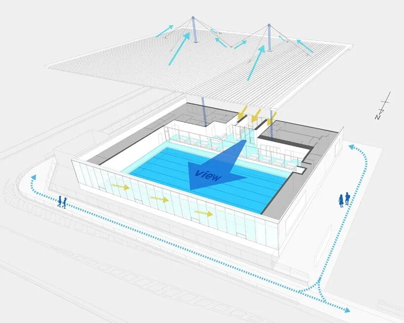 the project was born from the city’s decision to outsource swimming classes to a private company that specializes in indoor lessons. they focus on the healthy growth and safety of children while preventing the risks associated with outdoor pools. with this in mind, the architect’s main design intention was to create a pool where not only the staff could monitor the kids, but also parents and everyone else inside. by concentrating the vertical load on two mast columns, MASA architects created a pillar-free pool space to increase visibility. in addition, they designed a flat ceiling so that everyone’s line of sight reaches the poolside from the entrance.