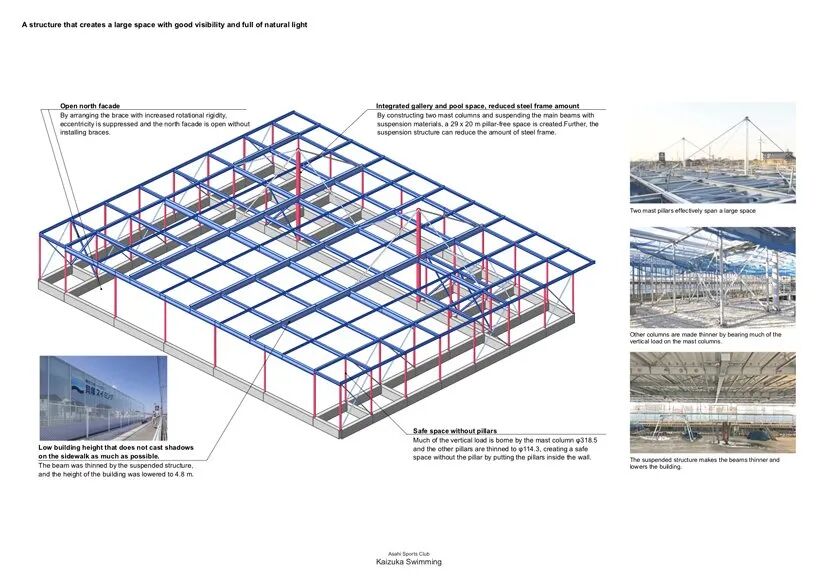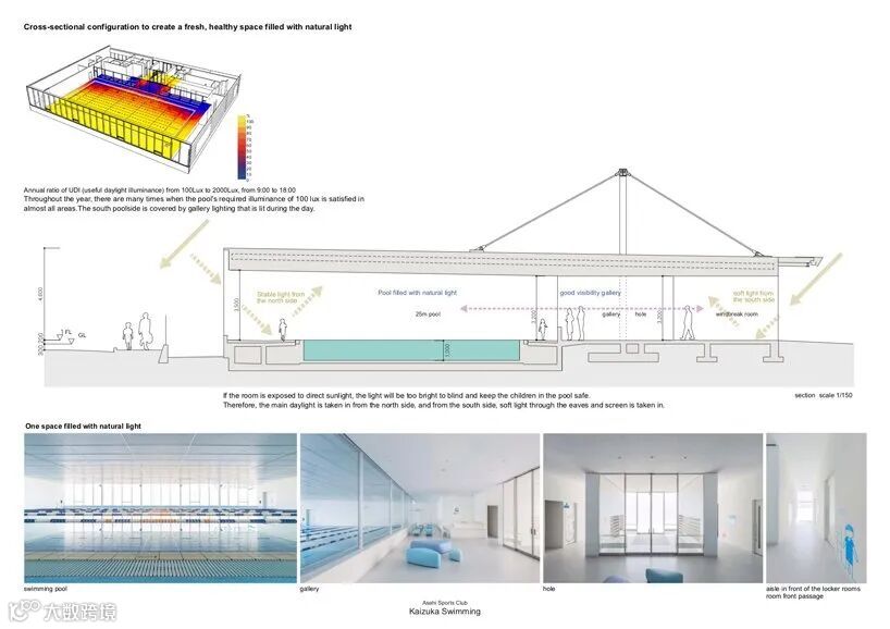 泳池内部唯一的窗户位于北侧立面,以获得柔和的散射光,防止阳光直射或水面反射。外部,两根桅杆柱子像帆船的帆一样突出,有助于使这个泳池成为当地人熟悉的地标。MASA建筑师希望这个游泳池能成为会津市民身边的设施,让他们长久地熟悉。