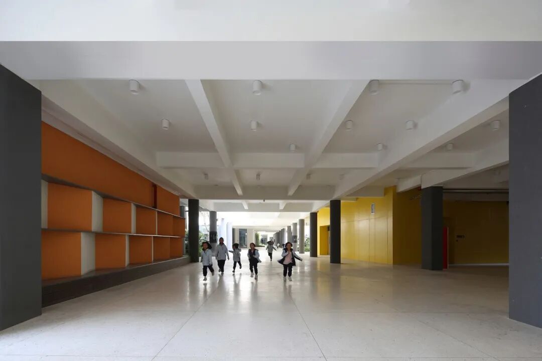 设计师强调交流、共享空间,针对不同功能区附近的公共空间,设计了不同主题、风格的布局与点缀,或设置储物空间,或增添休憩桌椅,或提供色彩鲜明的休闲设施,提高空间利用率的同时,丰富了学生们近距离开展课间娱乐的可能性,亦让学习的氛围不经意间渗透在生活中的每一个角落。