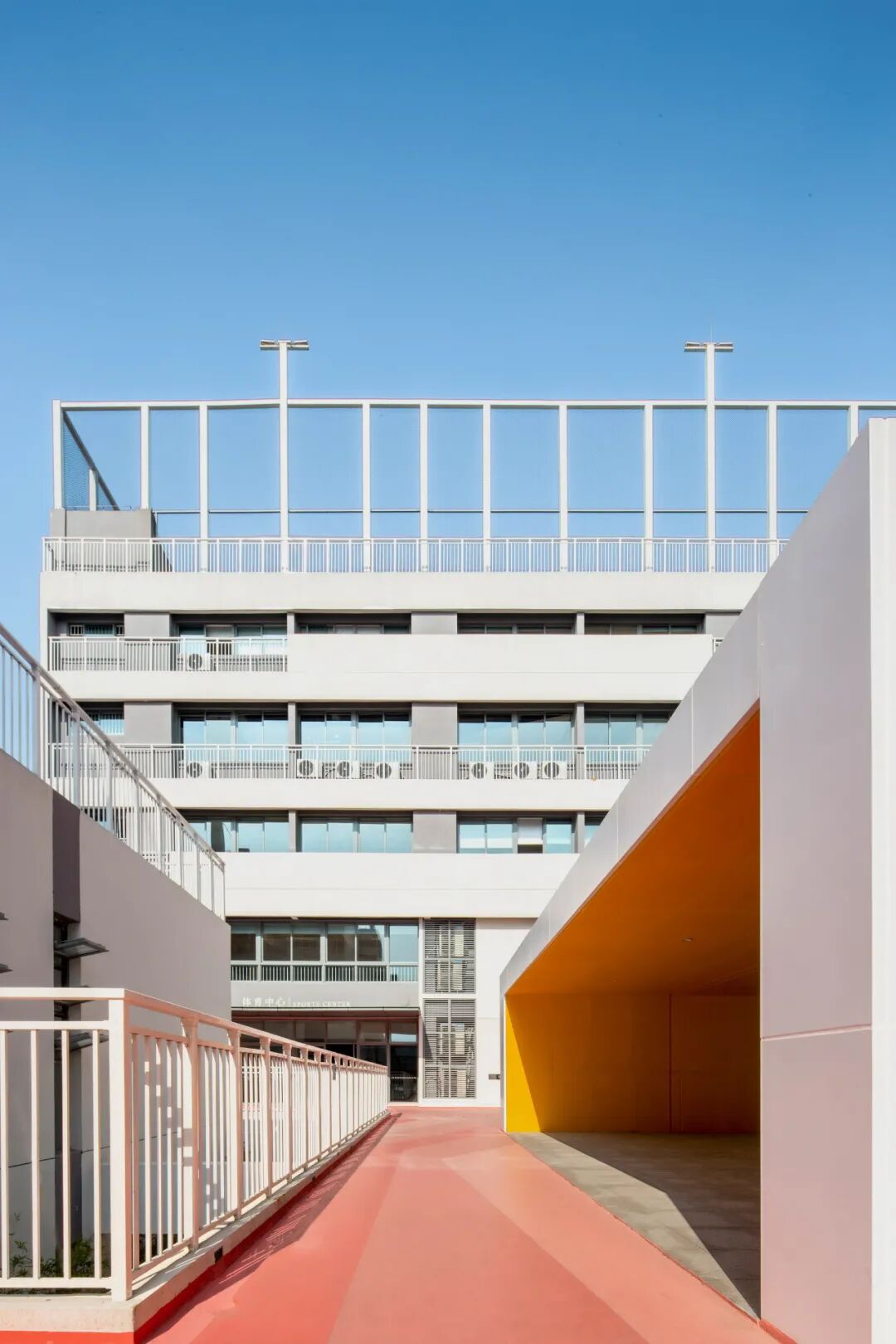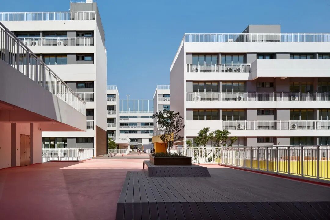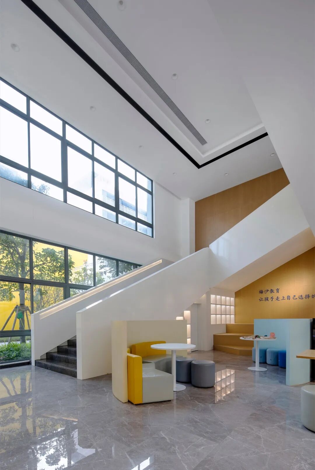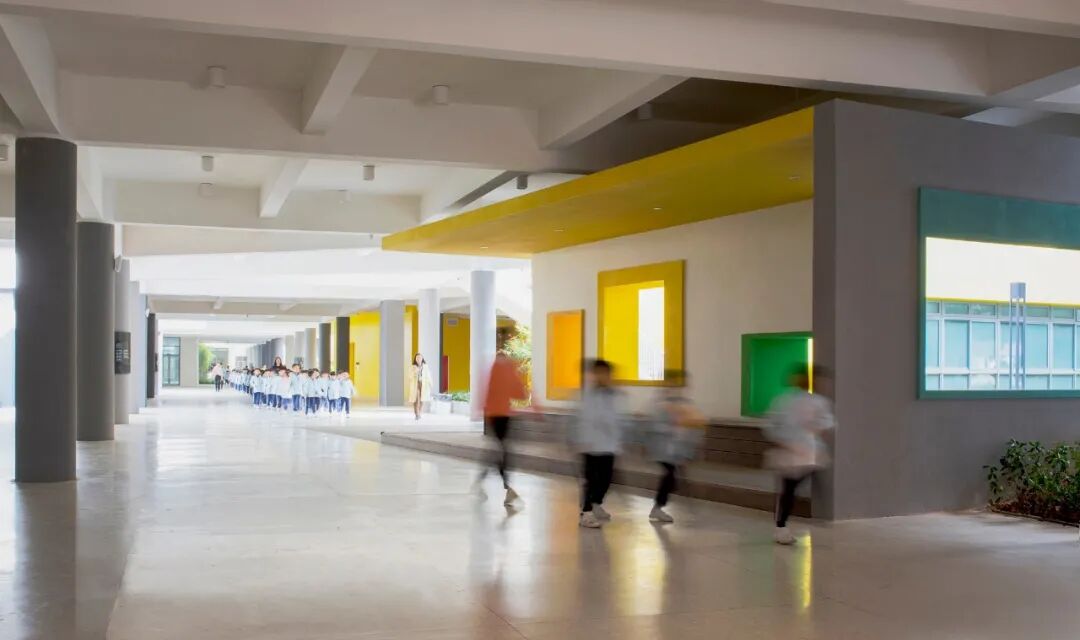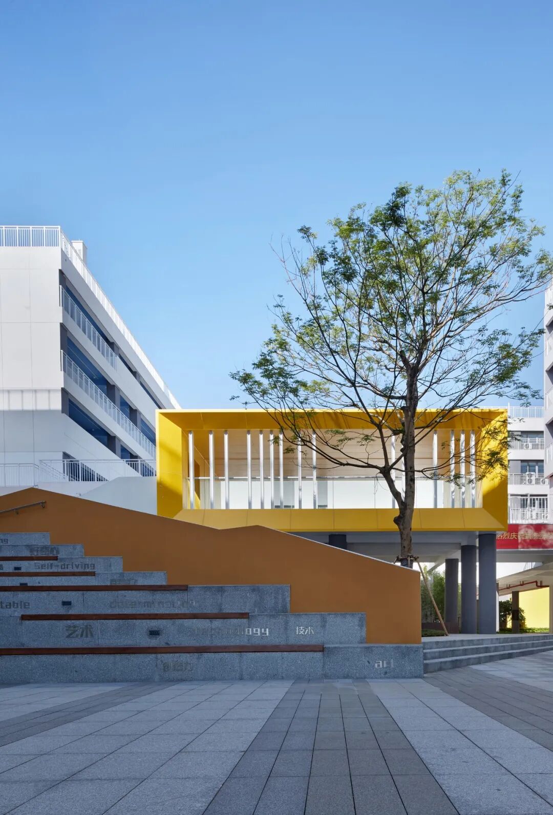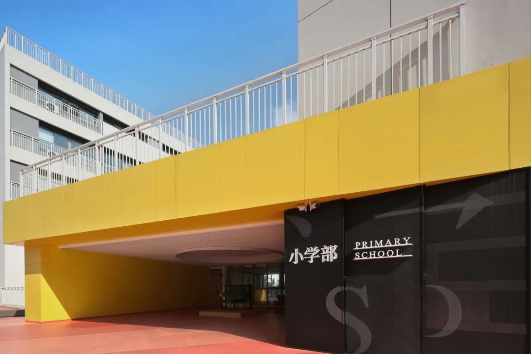 设计与建筑的体块关系、景观的立体绿化相应和,有效利用场地现有条件延展创意,户外阶梯与明黄外立面相映成趣,成为空间的一大亮点。以高差与进深的比例组合,户外阶梯可呈现出常规衔接功能与趣味性休闲平台两种使用状态,加之字符标识的点缀与扶手栏杆的辅助,增强场域的安全感,让学生们的课间游乐更添活力。