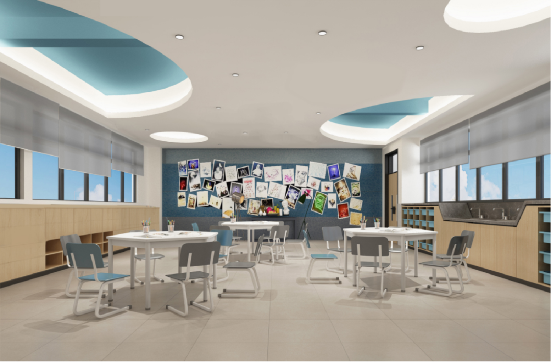 功能更丰富、灵活、多变的空间,不仅满足了以学生为主导的教学需要,亦带给师生多元、多维的体验感,适应面向未来的教育变化。室内设计思考复合型空间的存在,多样化重构与设置,与教学品质高效融合,具有强烈的沉浸感,有助于提高孩子们的学习积极性,同时在兴趣空间的启迪作用下,孩子们的思路也将像多维空间一样被完全打开。