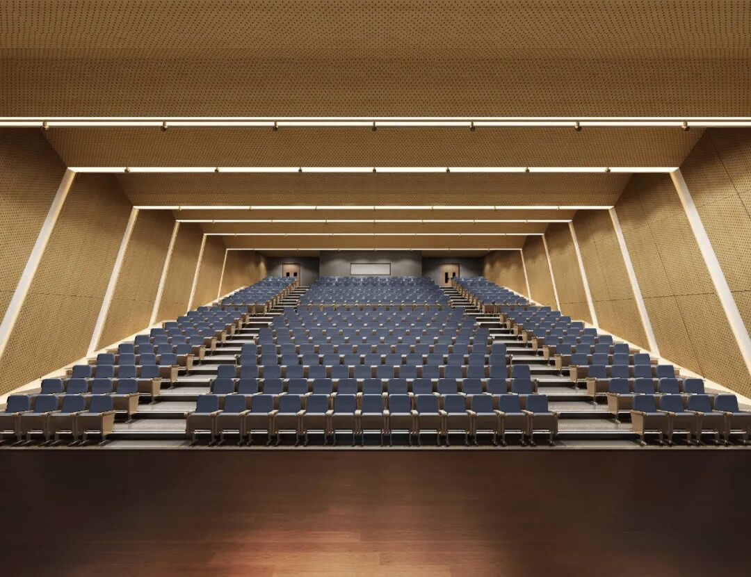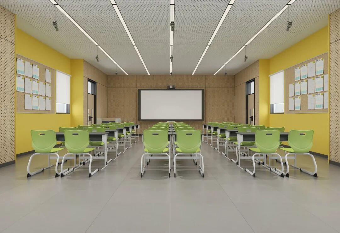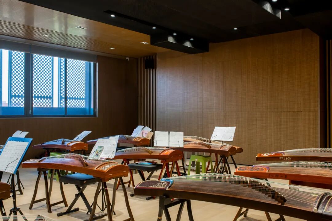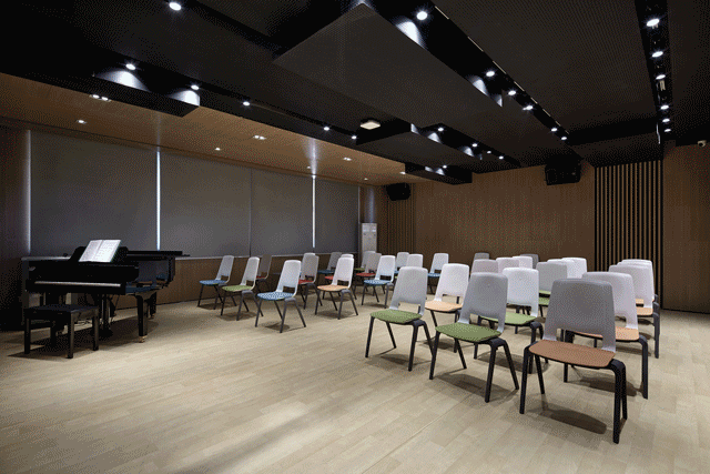 音乐教室格局轩阔,依托大面积吸音板保证声乐效果,同时有效避免声音对其它教学空间的干扰,于细节之中蕴含人文关怀。设计以木色为主基调,搭配静谧的黑色,与座椅的跳色形成强烈对比,带动空间活力。