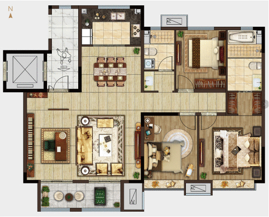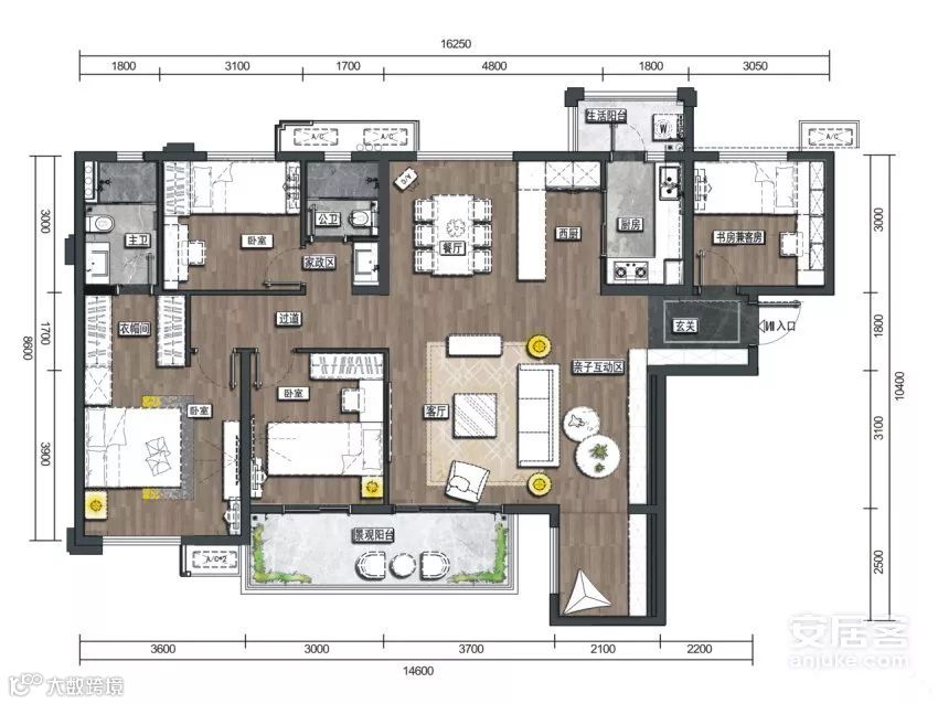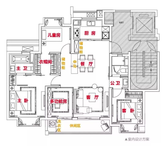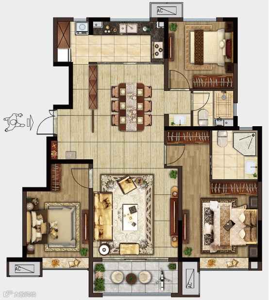 大户型空间宽敞、明亮,可以配置更多功能区,还具备更多布局设计。