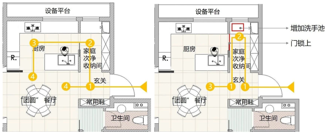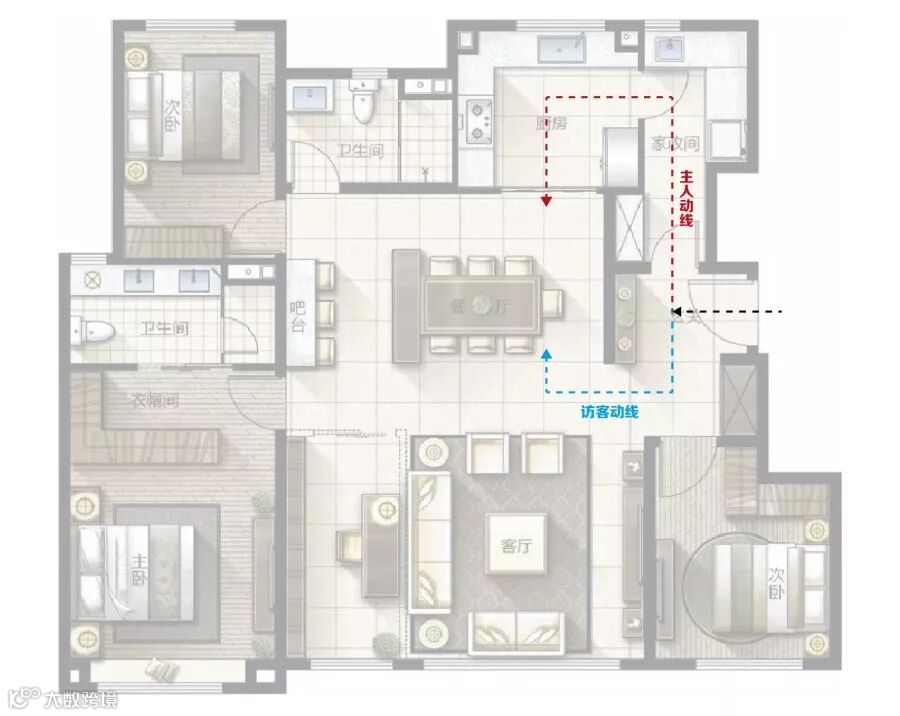 进门后,迎面是一堵墙,左拐进入客厅、南向次卧,那是礼仪玄关;右拐进入独立家政间,再进入厨房、绕回餐厅,那是家政玄关。