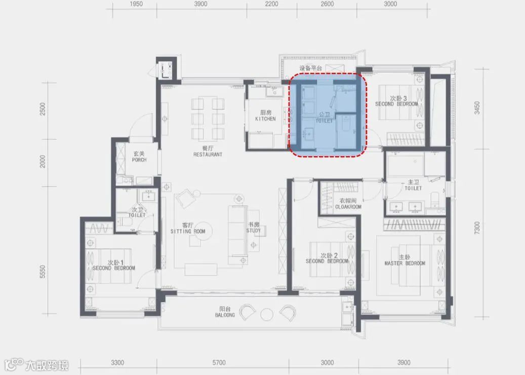 棠玥湾洋房164㎡户型的公卫:北面是可放洗衣机、烘干机的家政区和淋浴区,南面是台盆和马桶。南北区之间增加了一道移门,这样上厕所和洗澡就不会互相干扰,提高了公卫的使用率。