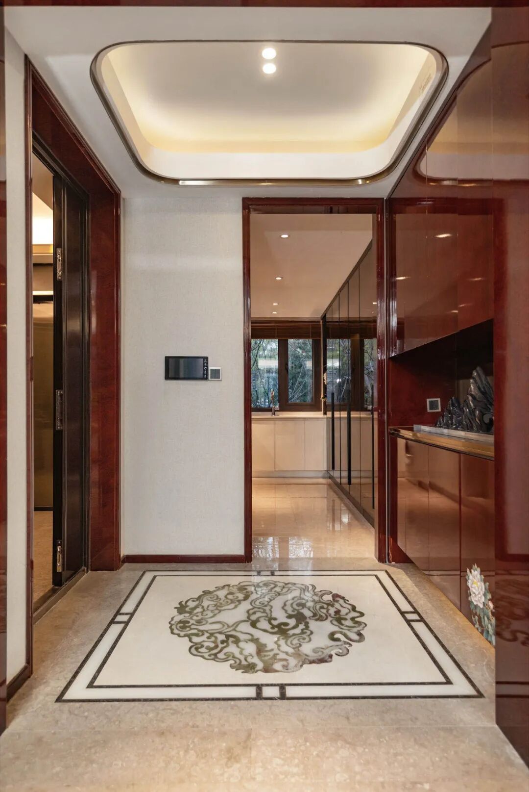 双玄关入户的设计非常贴近生活:主人购物归来,可拎着东西拐进家政间,穿过厨房,放下家政用品、米面粮油后,回到餐厅;客人来访,可直接进入客厅。