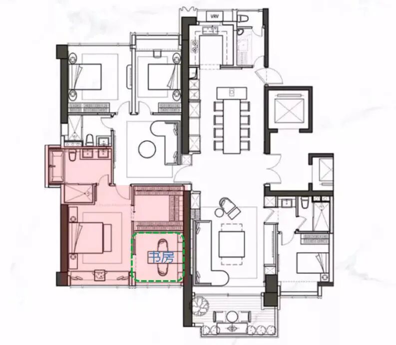 深圳龙华金茂府248㎡户型将书房放进了主卧,不仅增强卧室功能性的同时也大大提升居住空间整体舒适度和私密性。