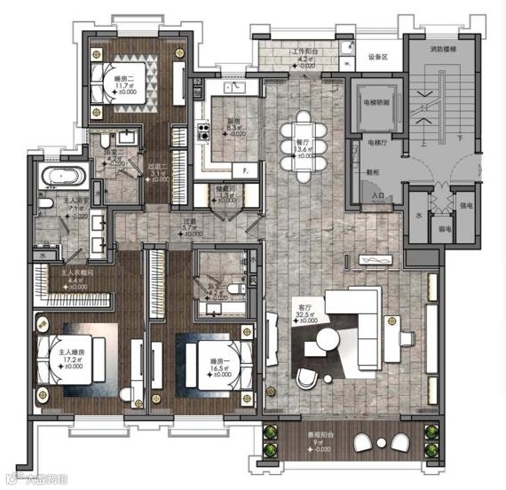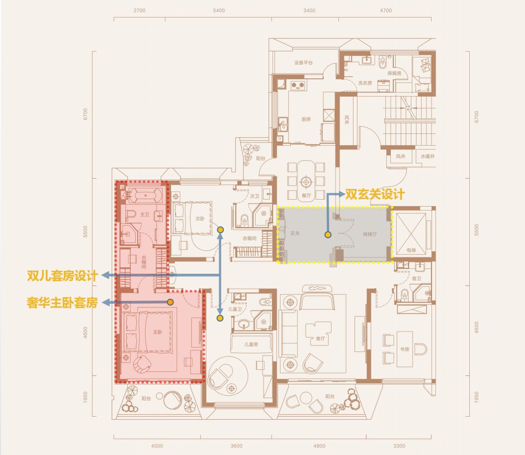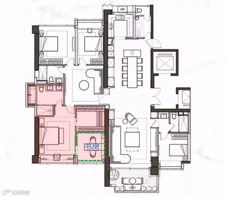 成都中铁建西派国樾230㎡户型,主卧超过30㎡,朝南的主卫双台盆、淋浴房、浴缸、马桶俱全,还配有双衣帽间,书房外可设门,关上门,就成了一个超级主卧套。