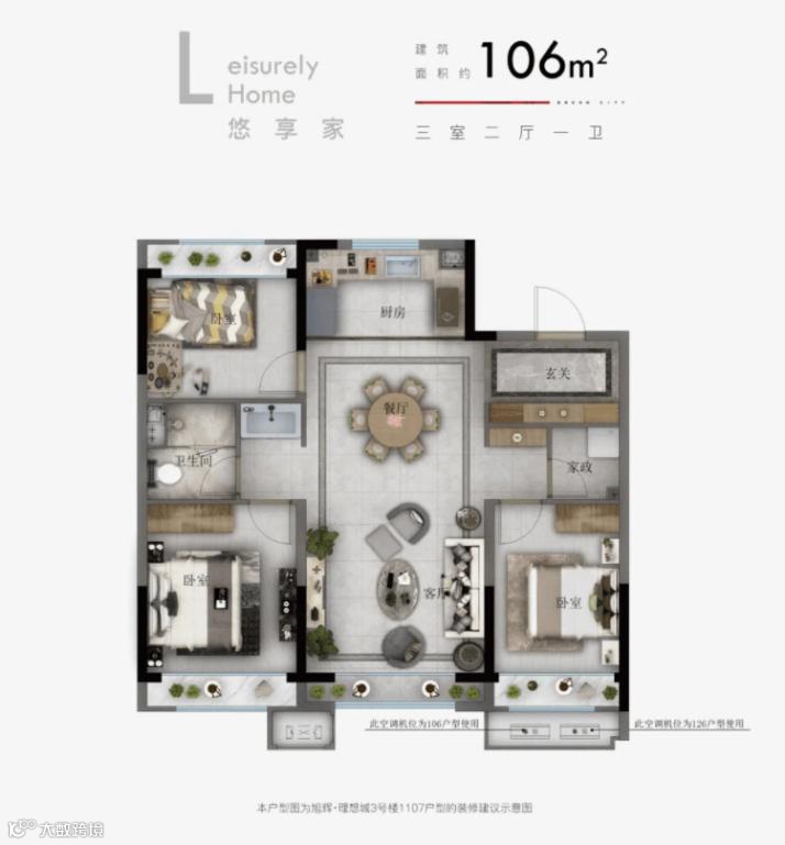 长春旭辉理想城106㎡户型最大的亮点是家政间的设计,日常生活的洗衣机、拖把、扫帚、杂物等等都可以放在这个空间,使家里看起来更整洁干净。