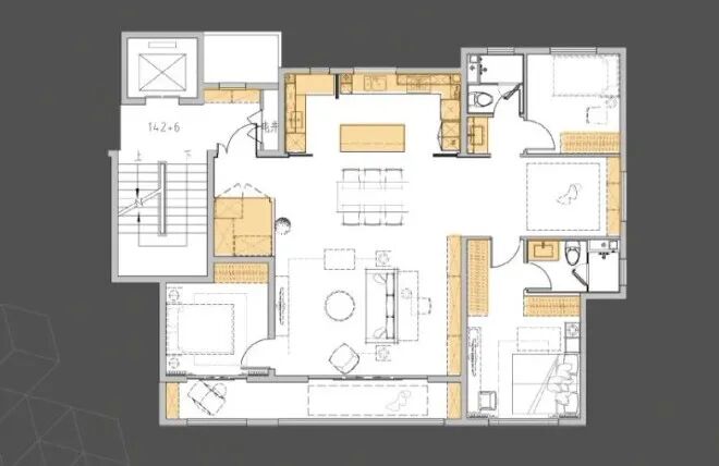 这个180平户型,让餐厅、厨房、客厅组成了一个完整的大空间,面积达到了30多平。