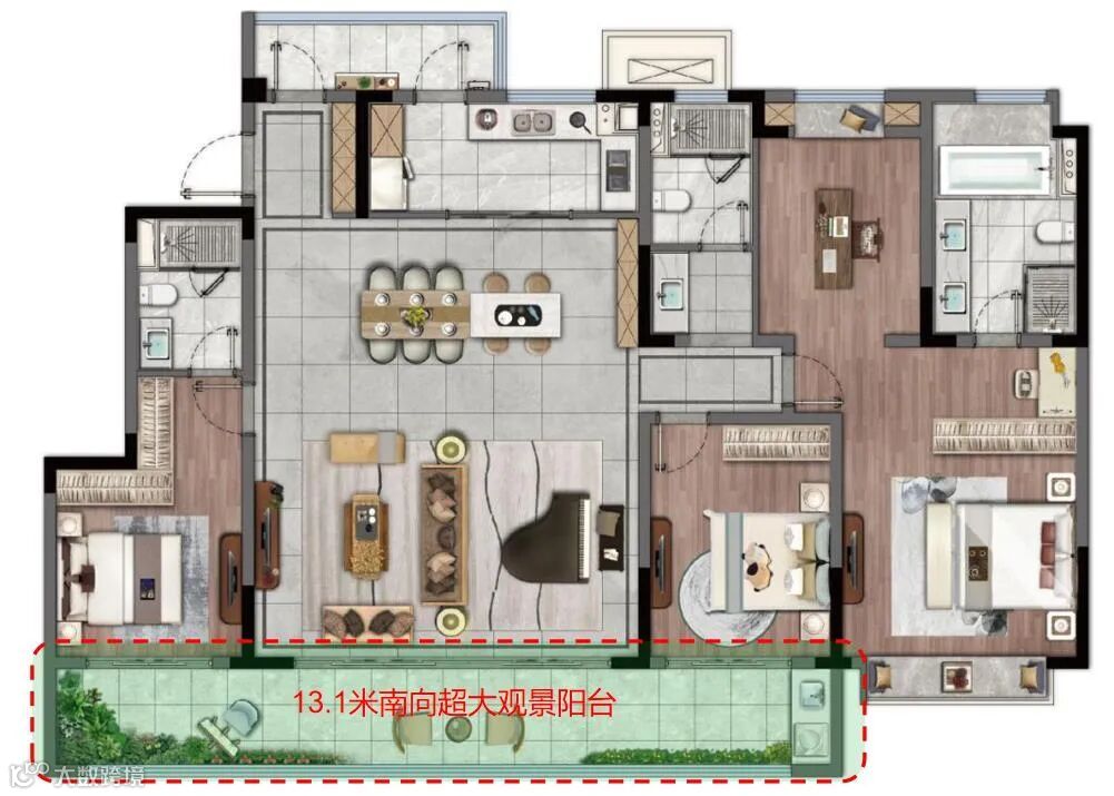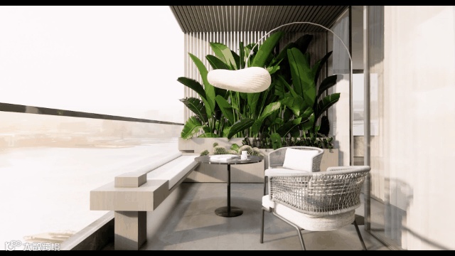 此外,把超大三边环绕的景观阳台环绕巨厅,营造更多生活场景的想象空间。